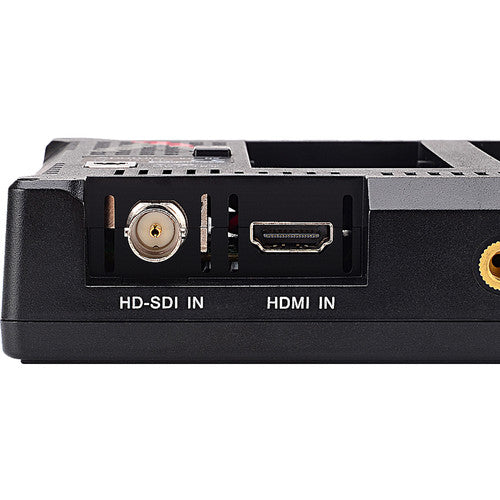 Featuring RGB waveform and histogram, as well as a vectorscope, the Aputure VS-5X V-Screen 7" On-Camera Monitor can be used to assist in consistent imagery throughout your production. HDMI and SDI I/O can connect to both consumer/prosumer gear, or professional and broadcast equipment, on either end. Cross conversion between the inputs and outputs even allows for consumer equipment to be used with broadcast equipment, and vice-versa. The 1920 x 1200 screen can fit Full HD images without scaling, while leaving room for data display such as timecode, scopes, and other relevant information. Scopes can be displayed as overlays, or side-by-side with a scaled down video image. Power can either be provided by the built-in NP-F battery slots, or via the 2.5mm barrel jack. A D-Tap cable is included for powering off professional batteries or power distribution plates. The 450 cd/m² screen is more than adequate for indoor viewing. A sun hood with mounting bracket is included to block glare outdoors. HDMI cables, a cleaning cloth, a shoe mount, and a carry pouch are also included to round out the package.