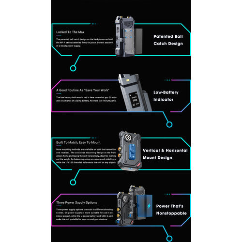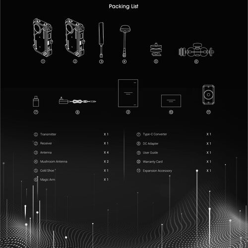 The system operates on the 5 GHz frequency band and is encrypted to prevent video leakage. The system supports smart channel selection, allowing the system to choose the cleanest channel for transmission. It also supports UVC pull streaming. Both units also feature a bright, easy-to-read OLED display. Each unit is designed to be powered via an L-series battery plate, by the included D adapter, or with an optional USB power supply via the USB Type-C port. Four standard antennas and two mushroom antennas are supplied for the receiver and transmitter.