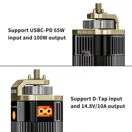 The ZG-H90 Battery Grip Handle from ZGCINE easily adds hand-held convenience to your video and photo lighting accessories. Its built-in 90Wh 14.8V battery can be recharged via the included USB-C charging cable. Its two output ports, one USB-C PD and one D-Tap, provide 20V and 14.8V of power, respectively. The light stand adapter with 1/4"-20 screw makes it widely compatible with a variety of equipment, which is further expanded thanks to the included light stand adapter.